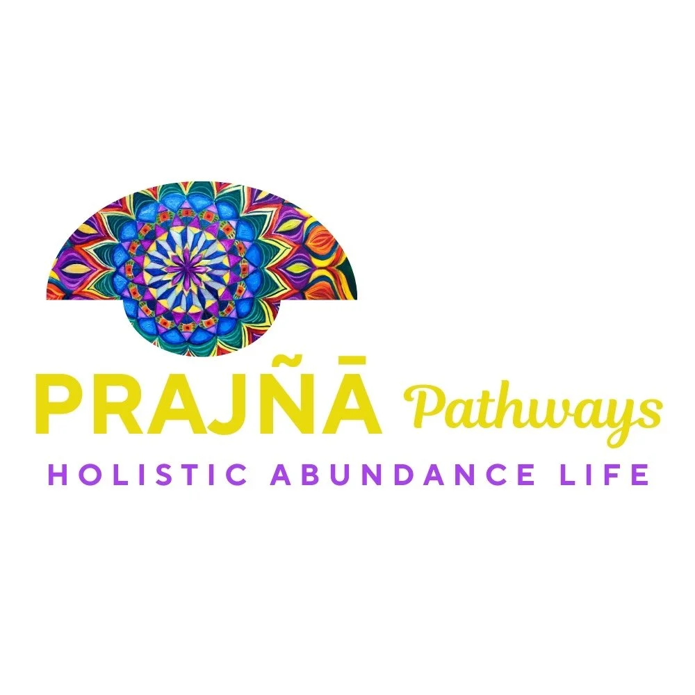 Colorful mandala with the text 'PRAJNĀ Pathways' and 'Holistic Abundance Life' in yellow and purple fonts.